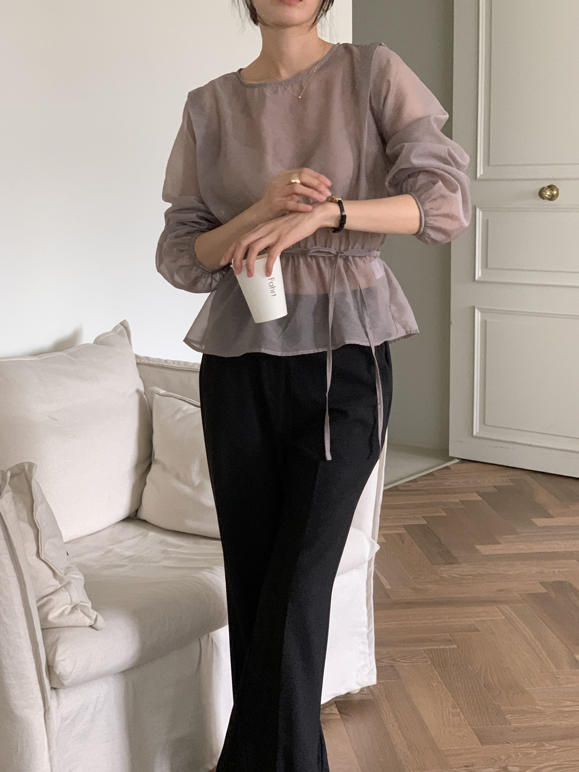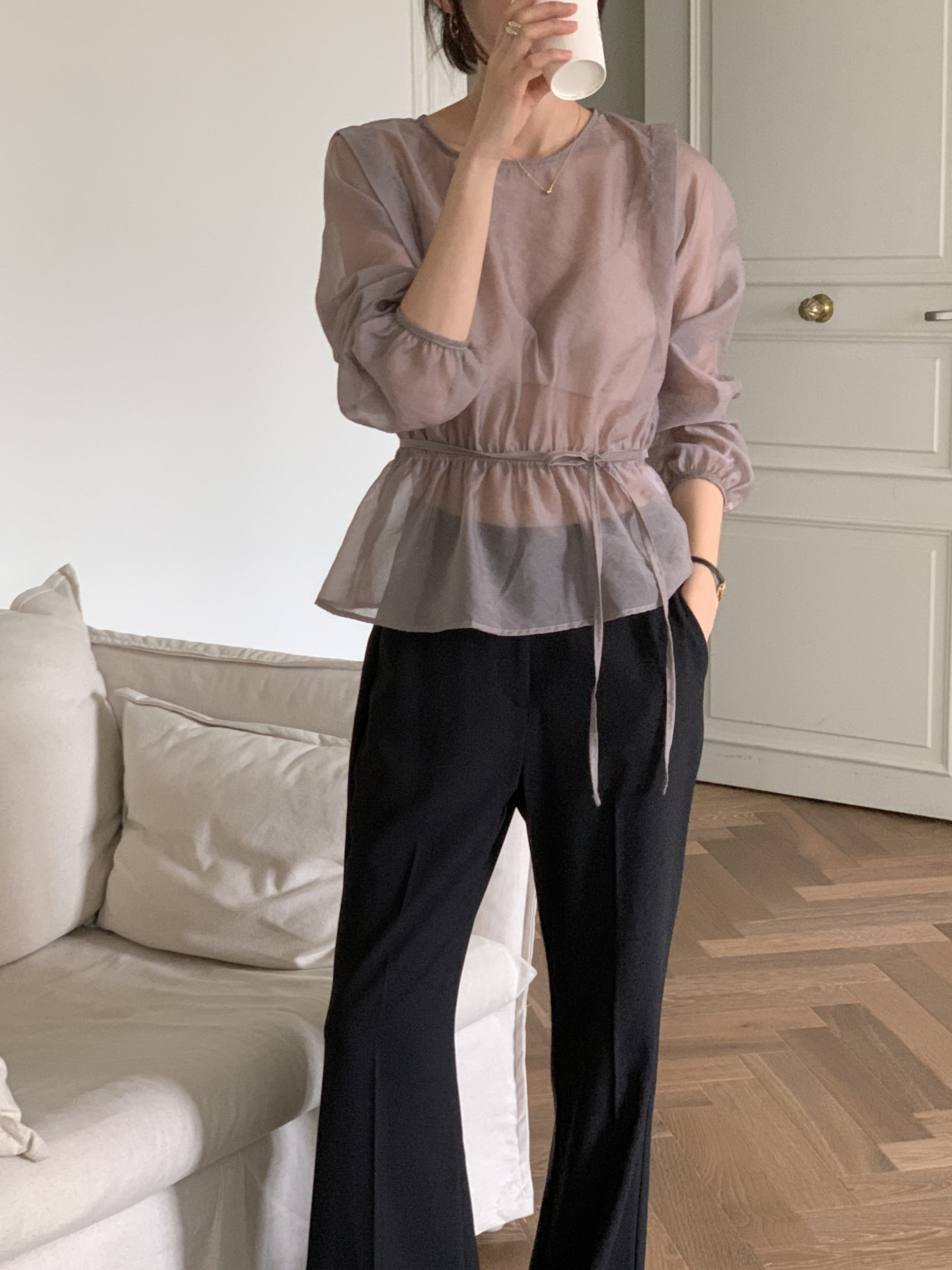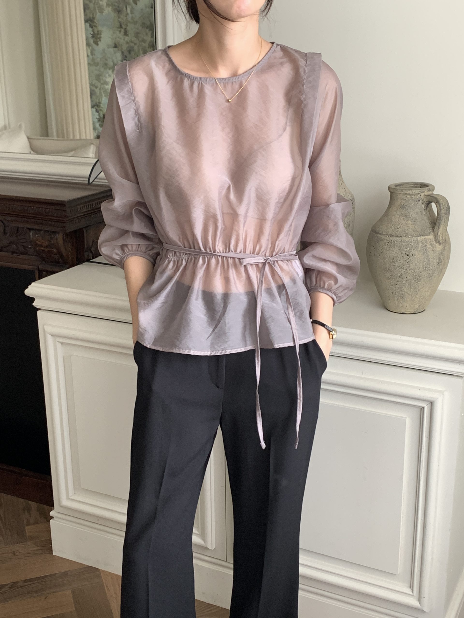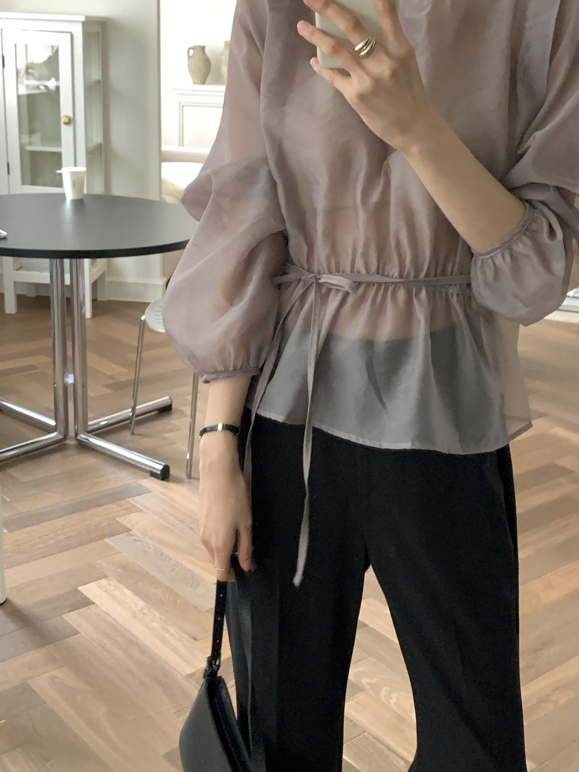 Description Lightweight sheer blouse with a subtle shine, adjustable waist tie,