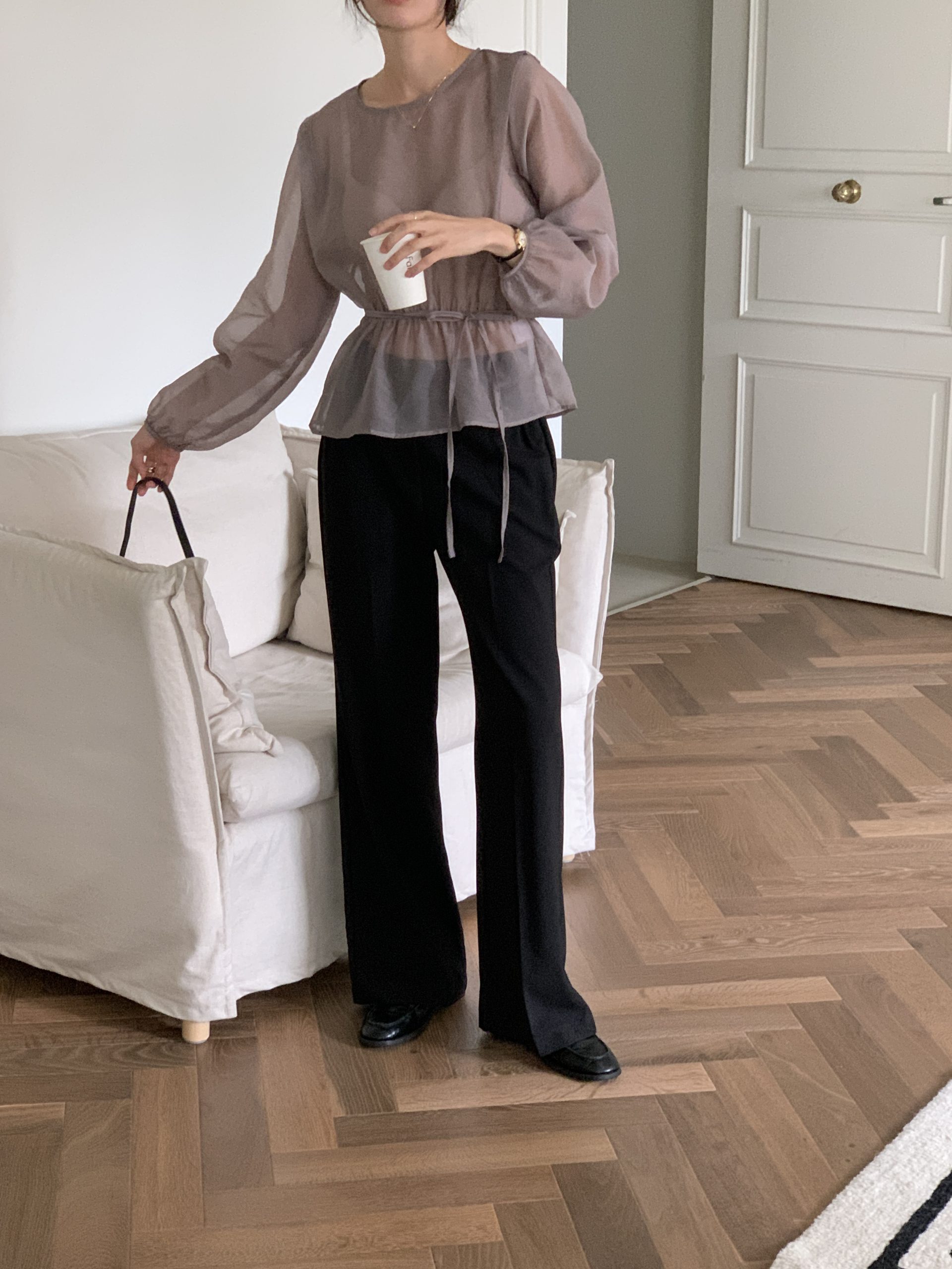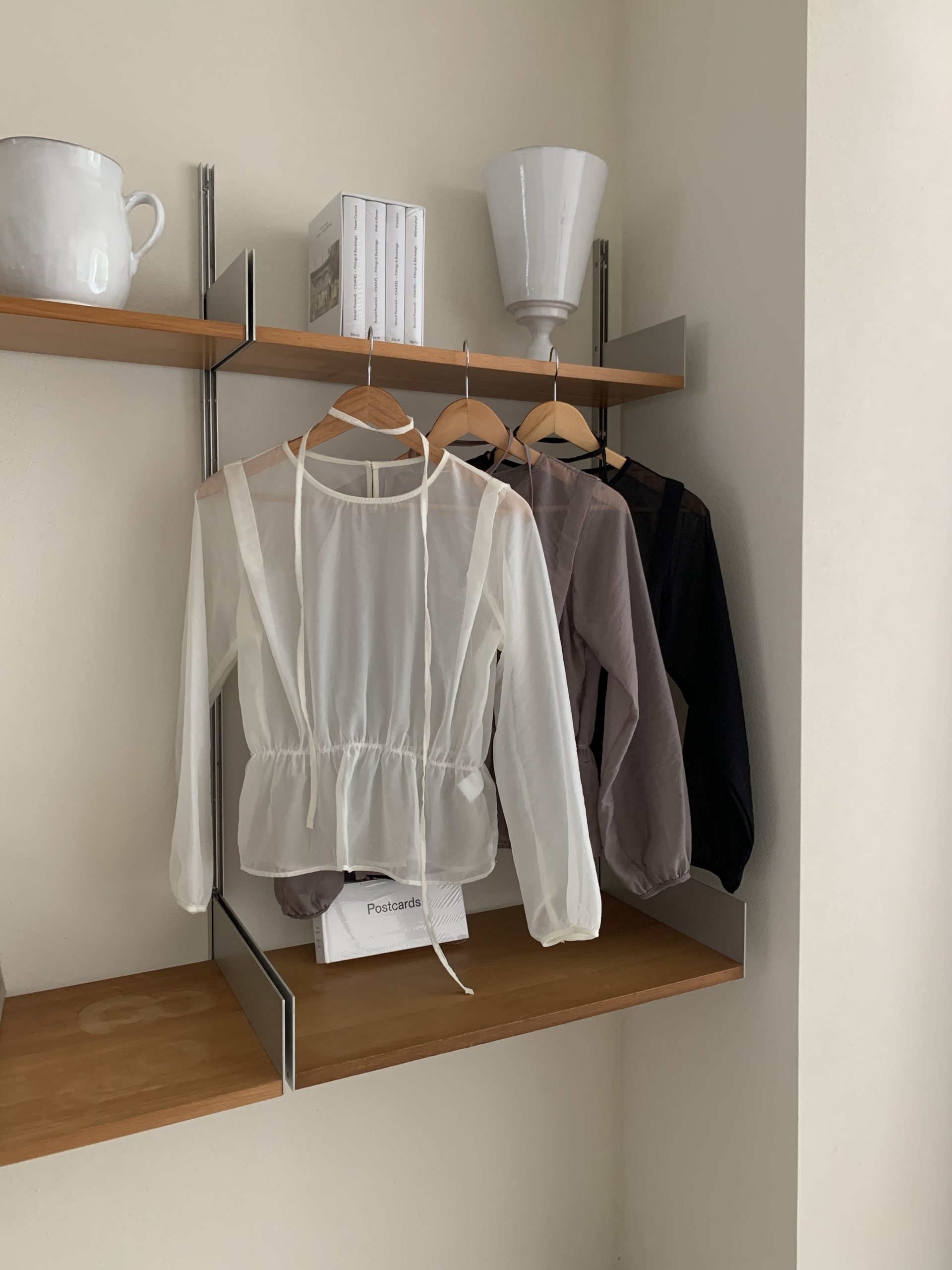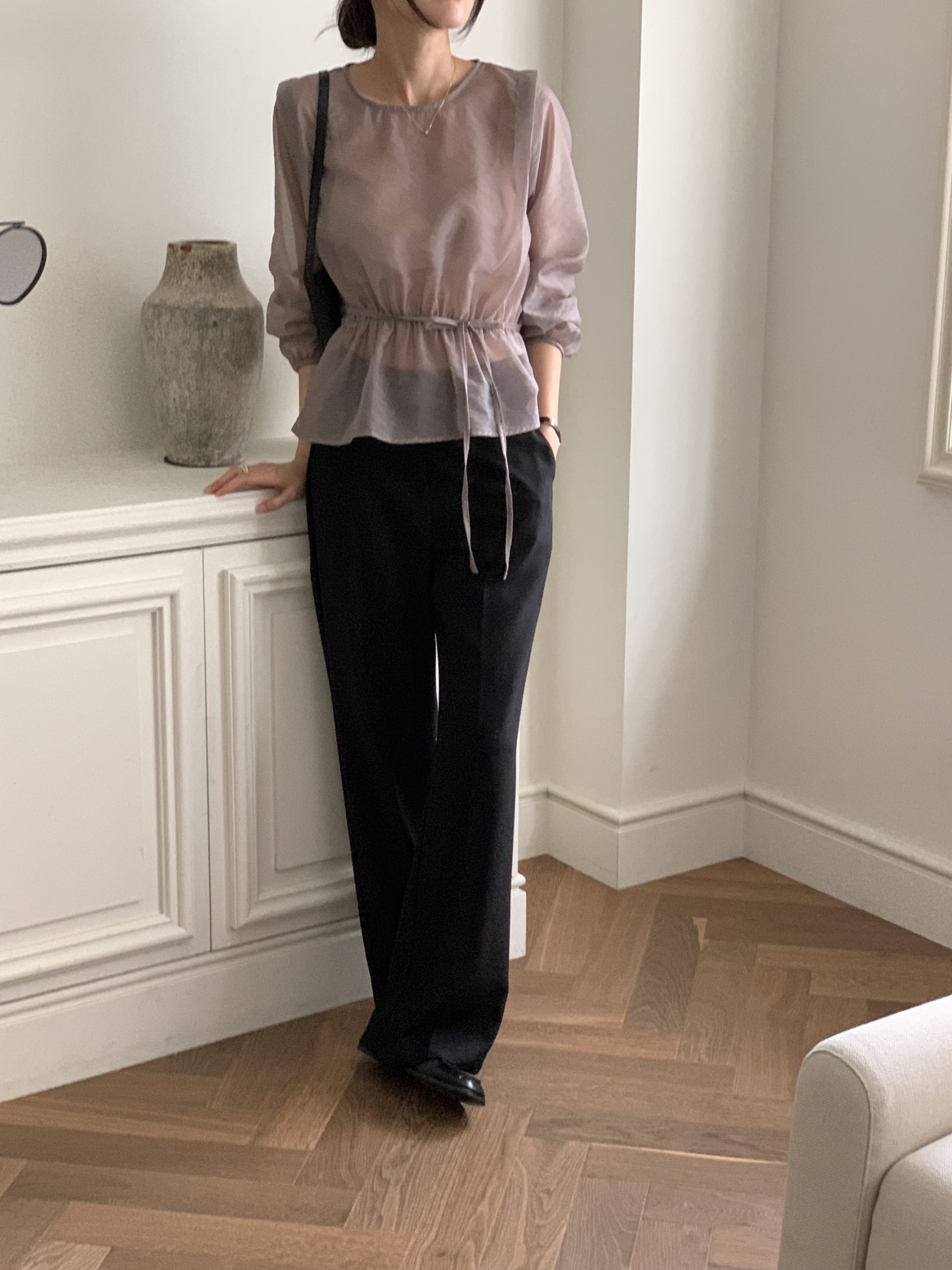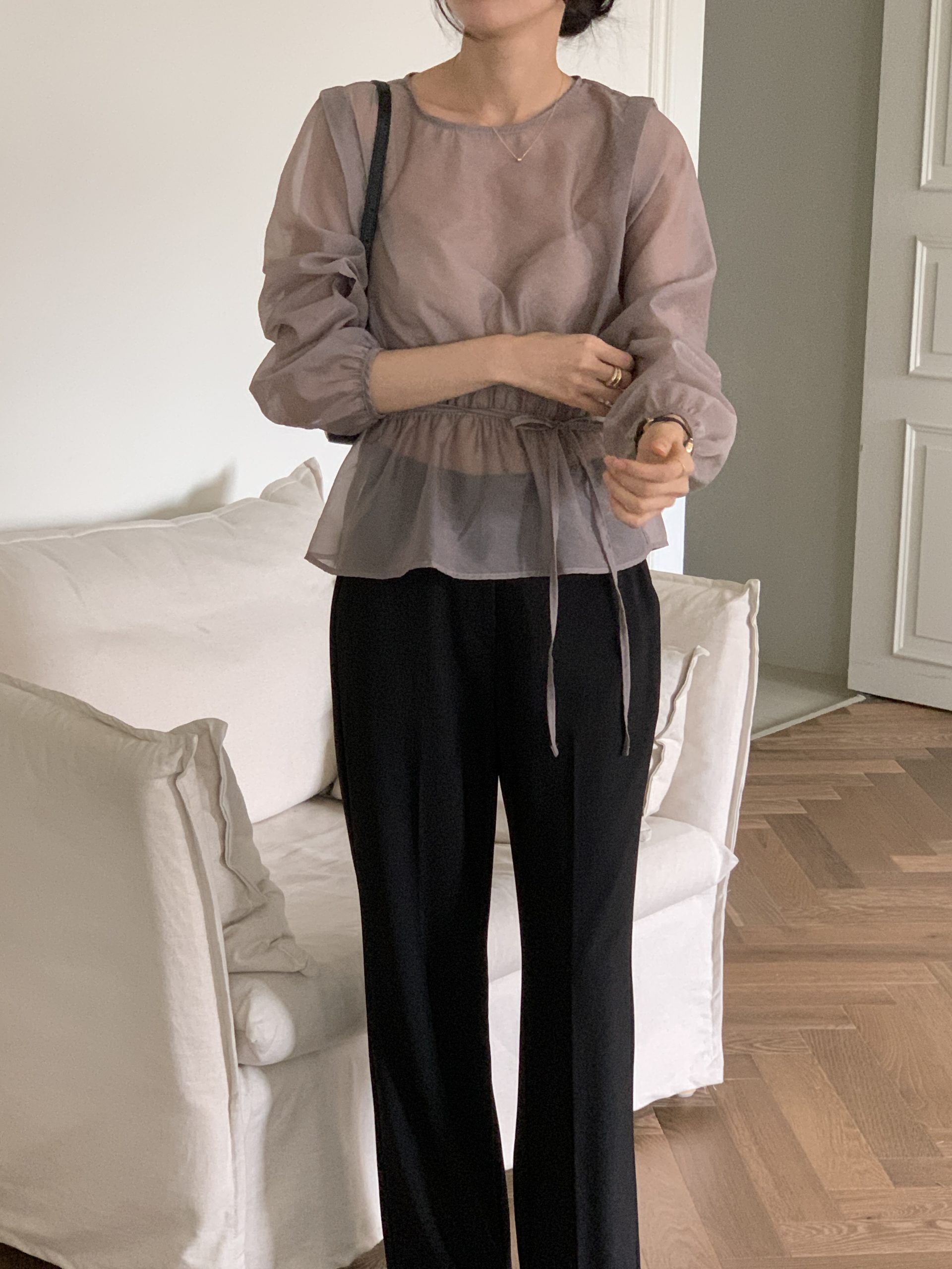 Description Lightweight sheer blouse with a subtle shine, adjustable waist tie,