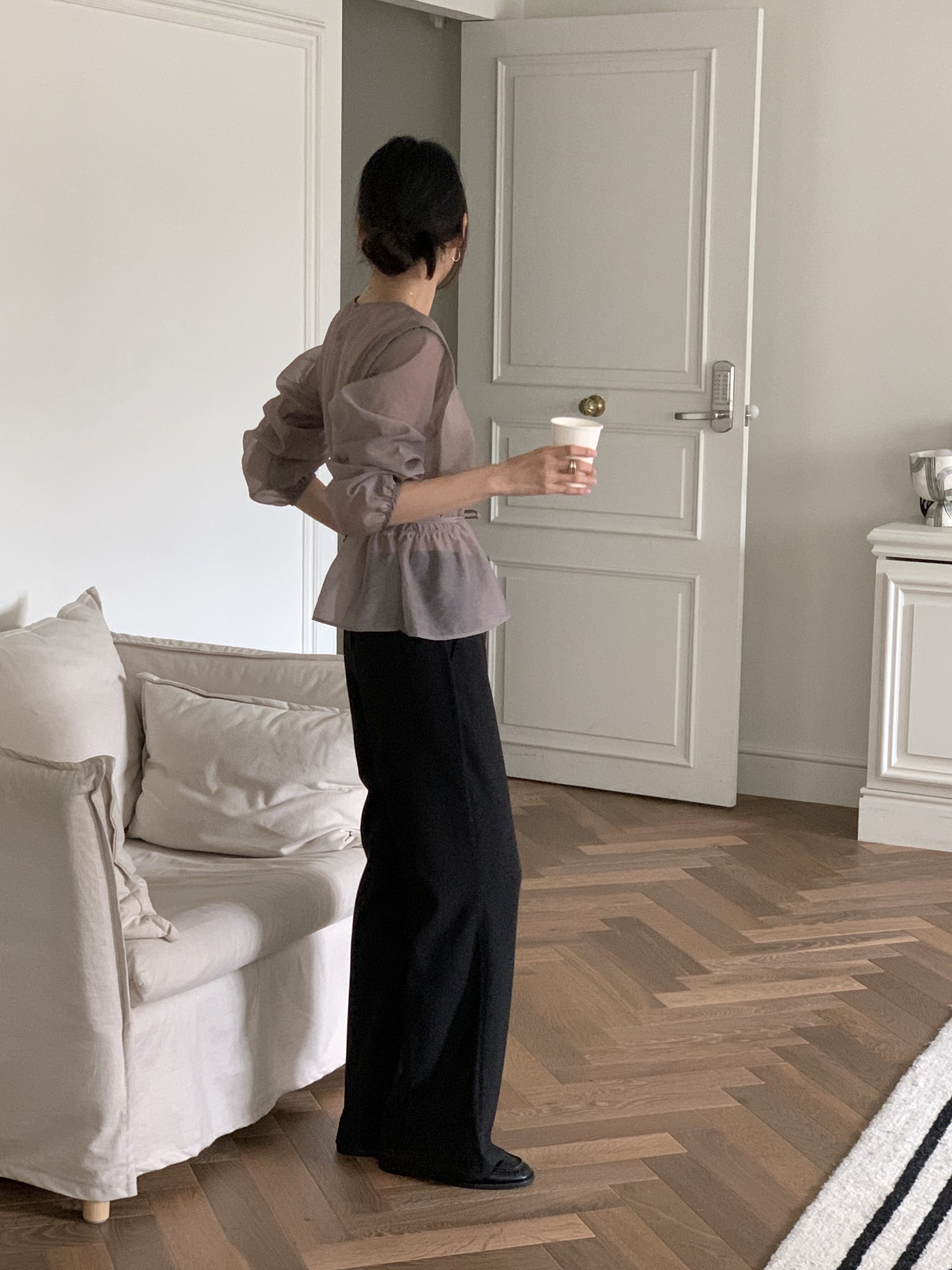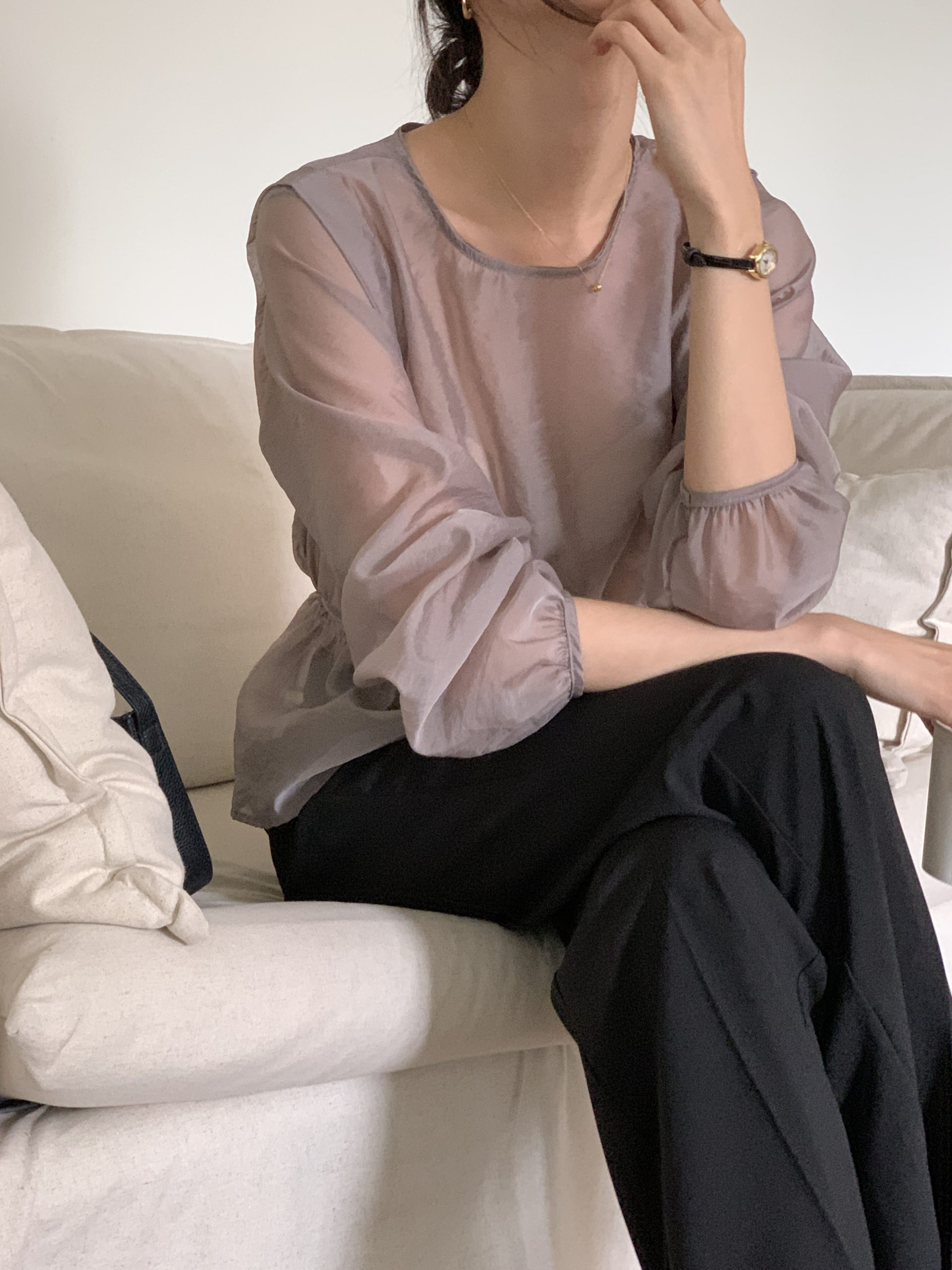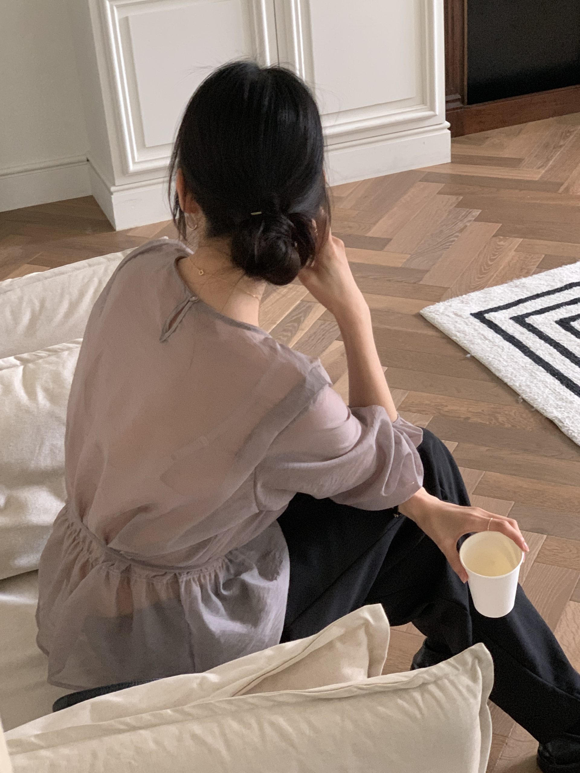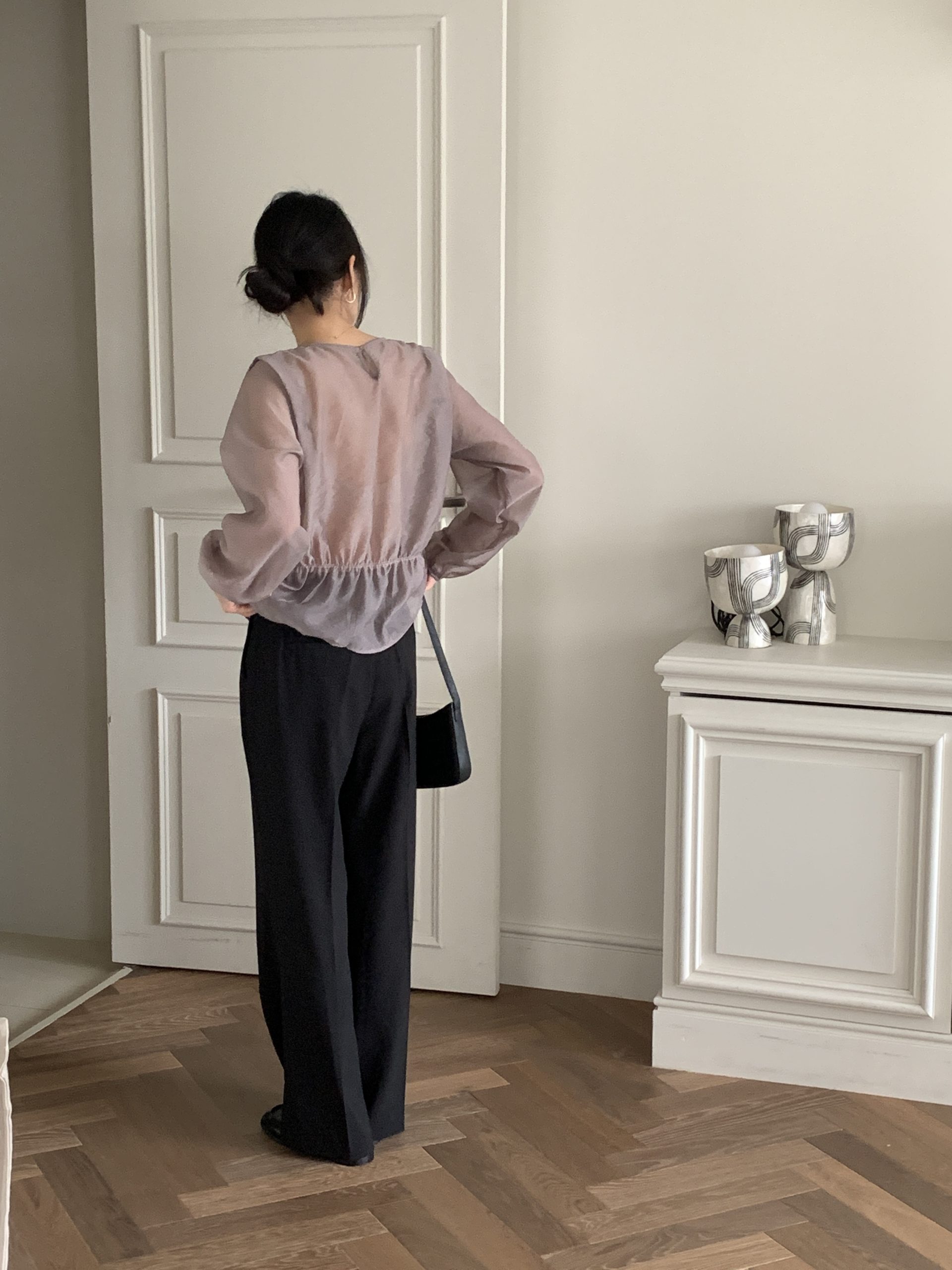 Description Lightweight sheer blouse with a subtle shine, adjustable waist tie,