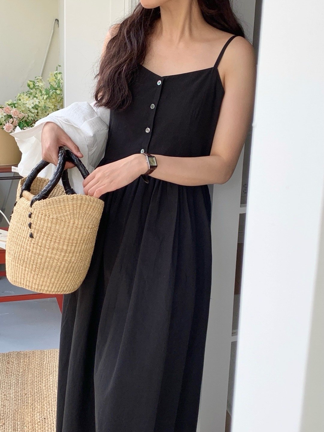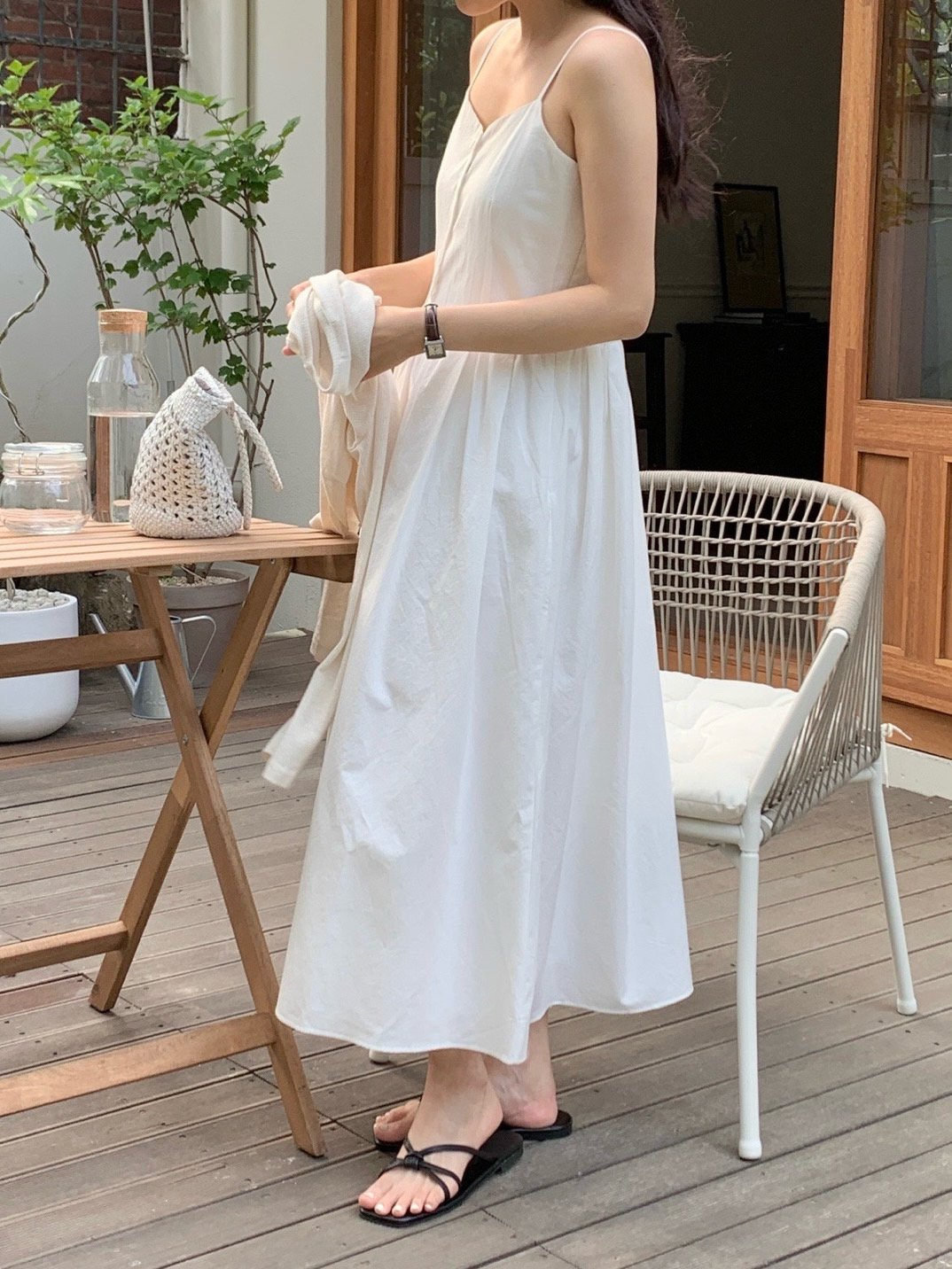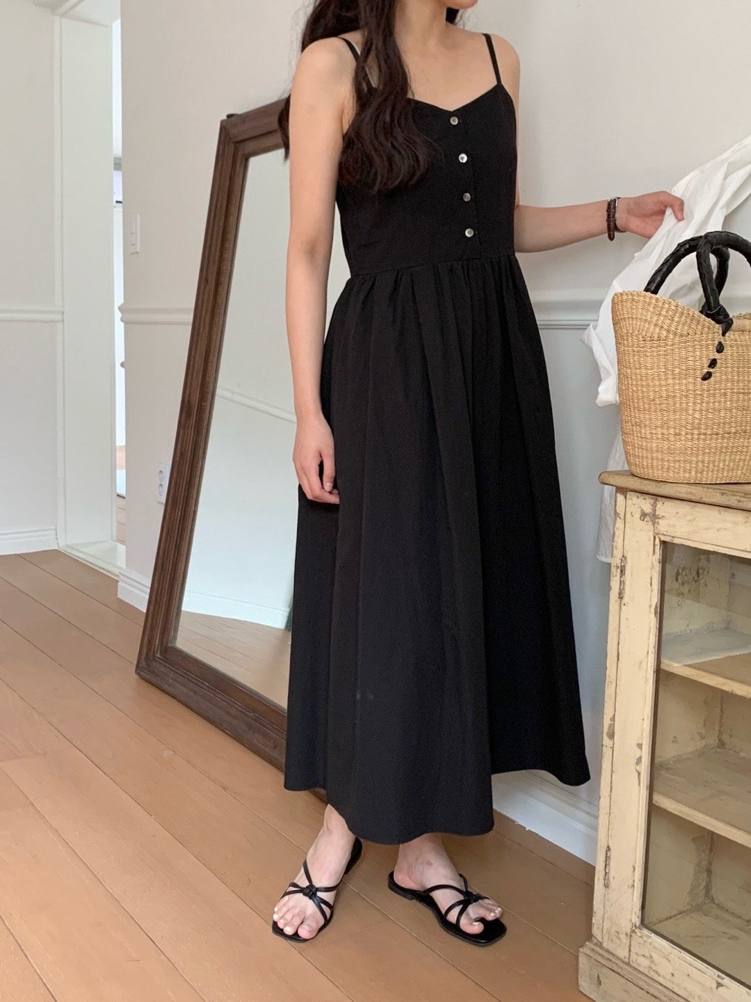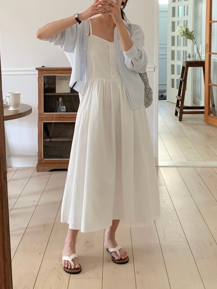 Description A sleeveless midi dress with slender straps and a softly flared skirt. The front button detail adds a subtle accent, while the fitted bodice creates a clean, feminine silhouette. Perfect for summer days, easily styled alone or layered with a light shirt for an effortless look.