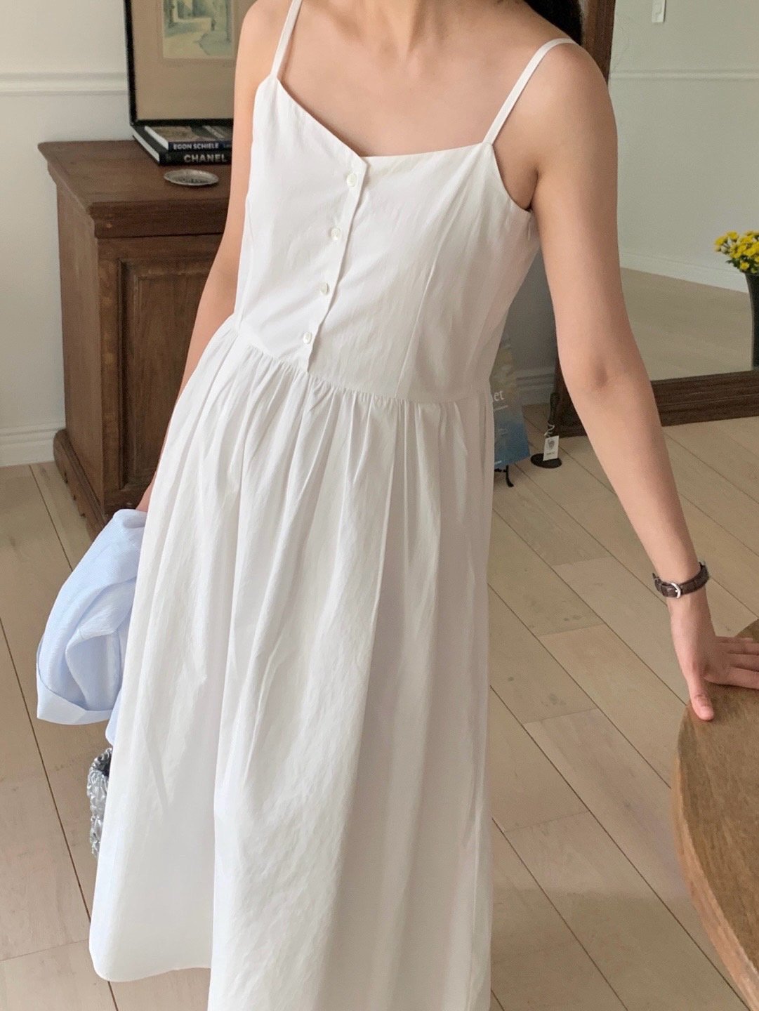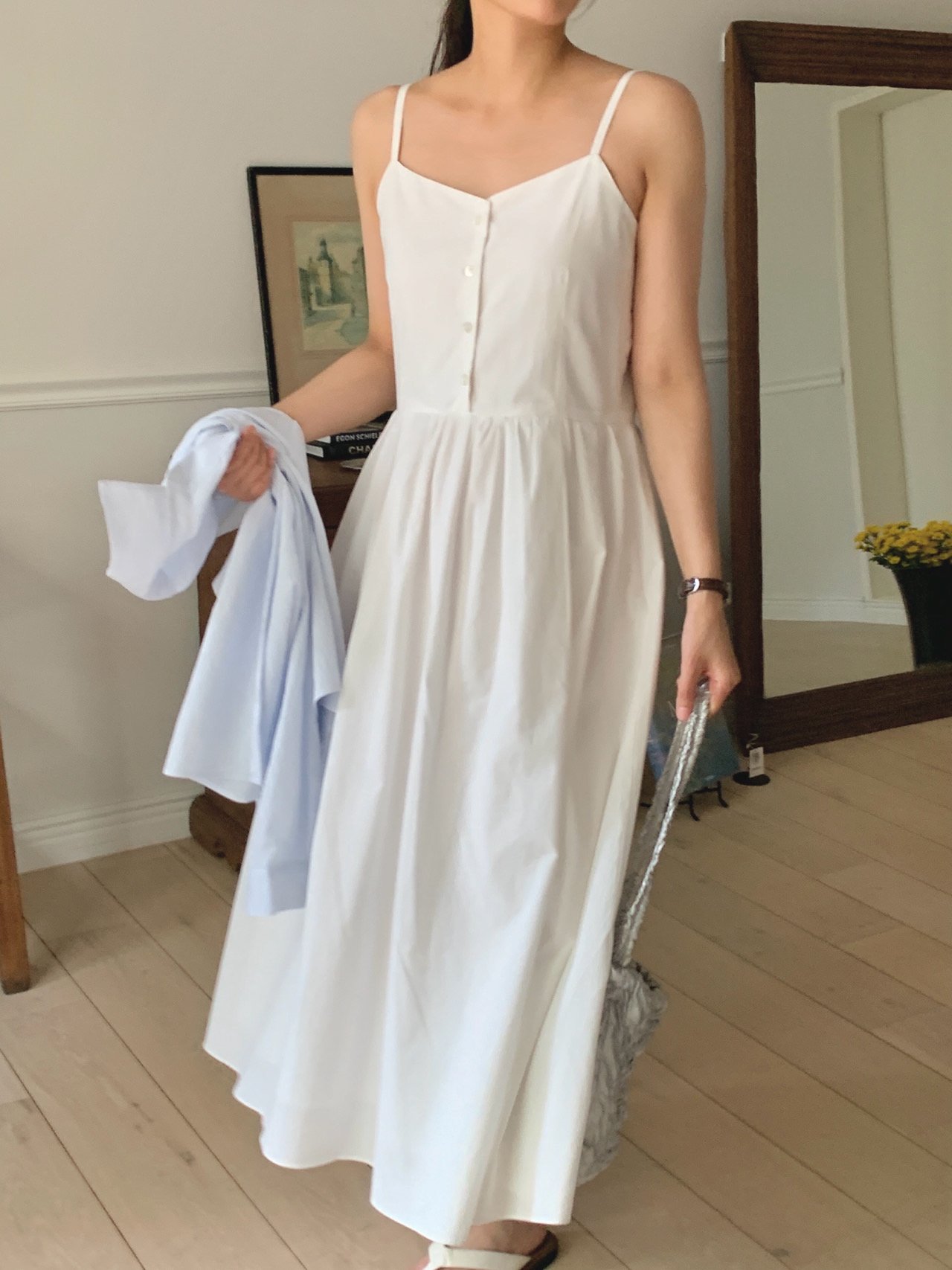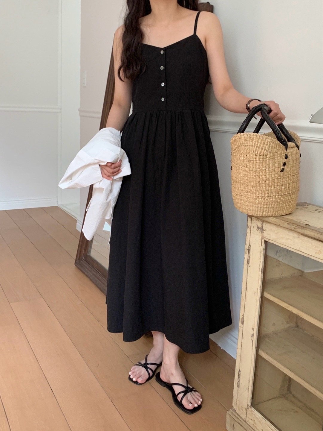 Description A sleeveless midi dress with slender straps and a softly flared skirt. The front button detail adds a subtle accent, while the fitted bodice creates a clean, feminine silhouette. Perfect for summer days, easily styled alone or layered with a light shirt for an effortless look.