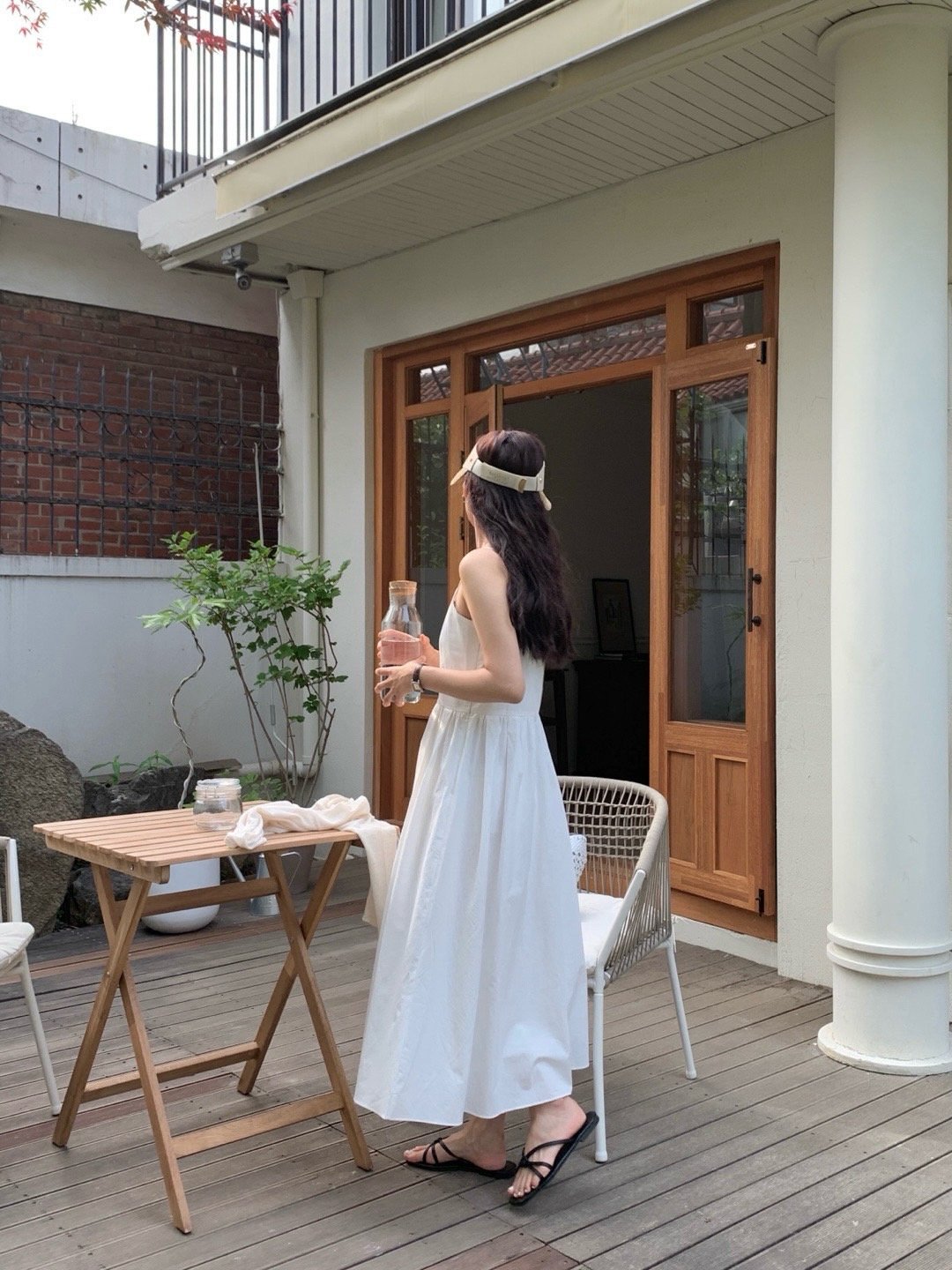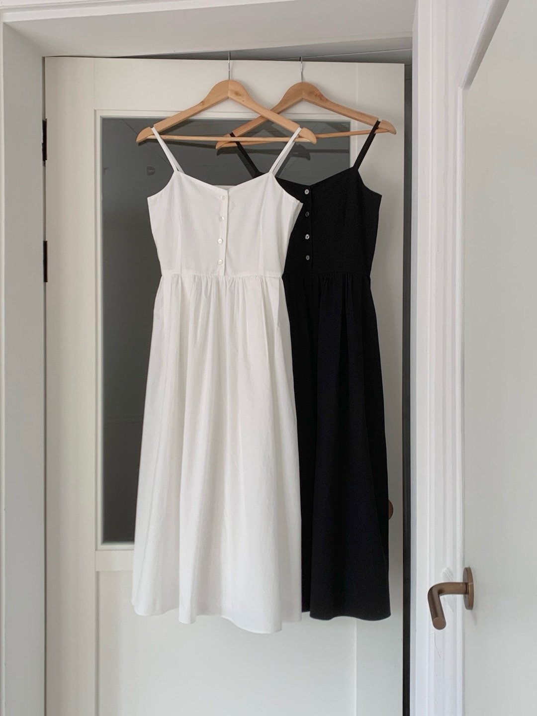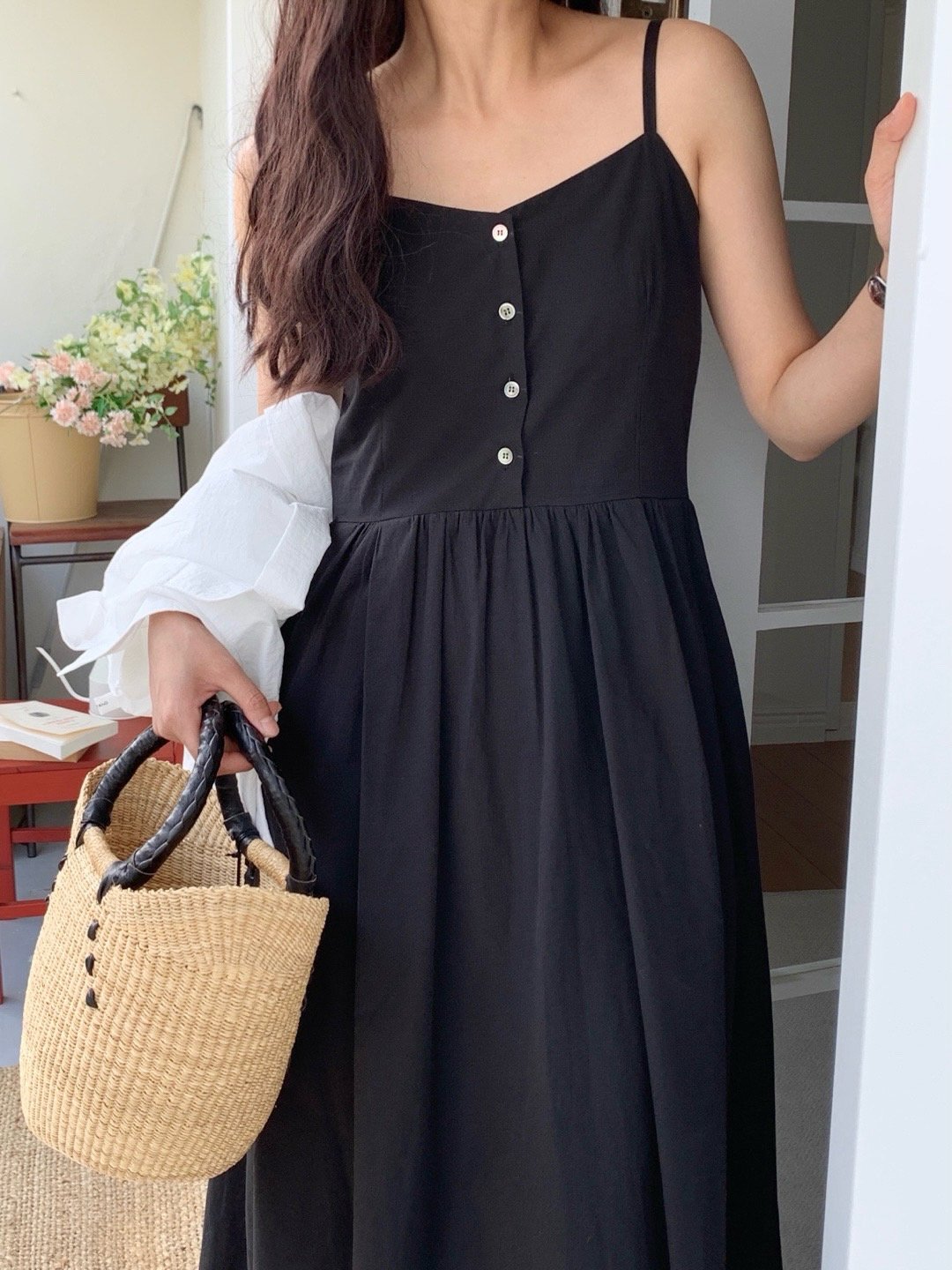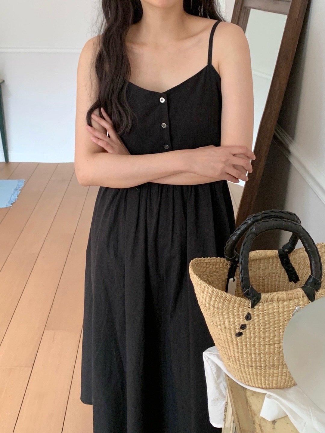 Description A sleeveless midi dress with slender straps and a softly flared skirt. The front button detail adds a subtle accent, while the fitted bodice creates a clean, feminine silhouette. Perfect for summer days, easily styled alone or layered with a light shirt for an effortless look.