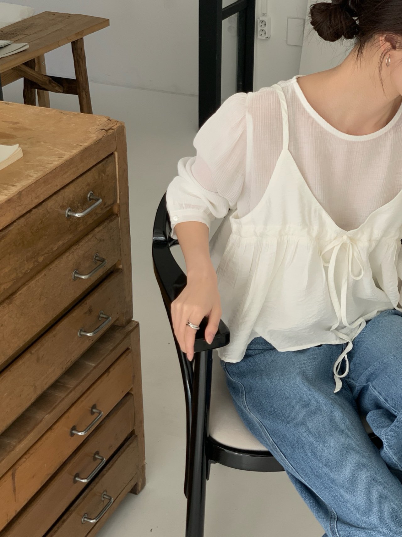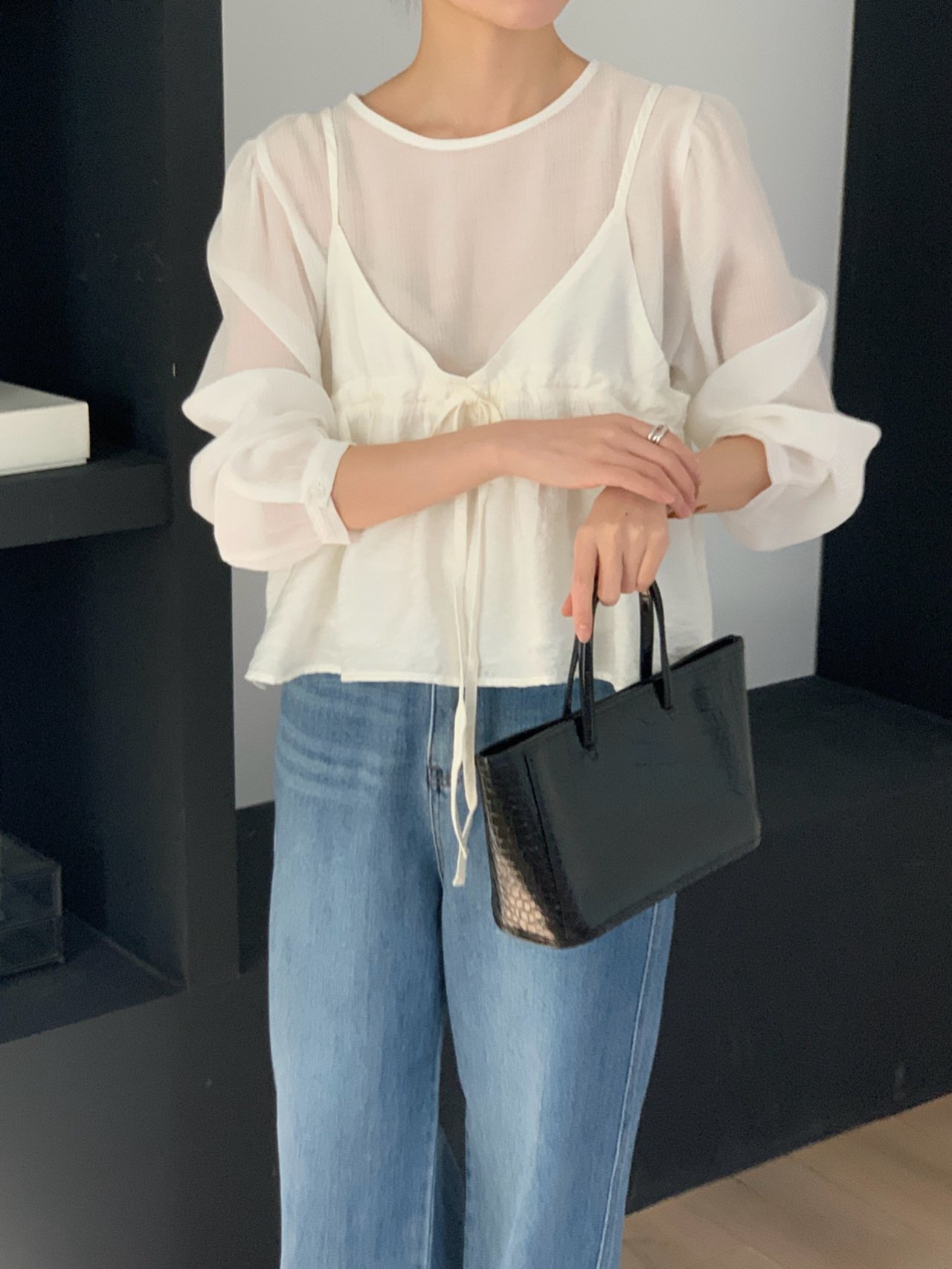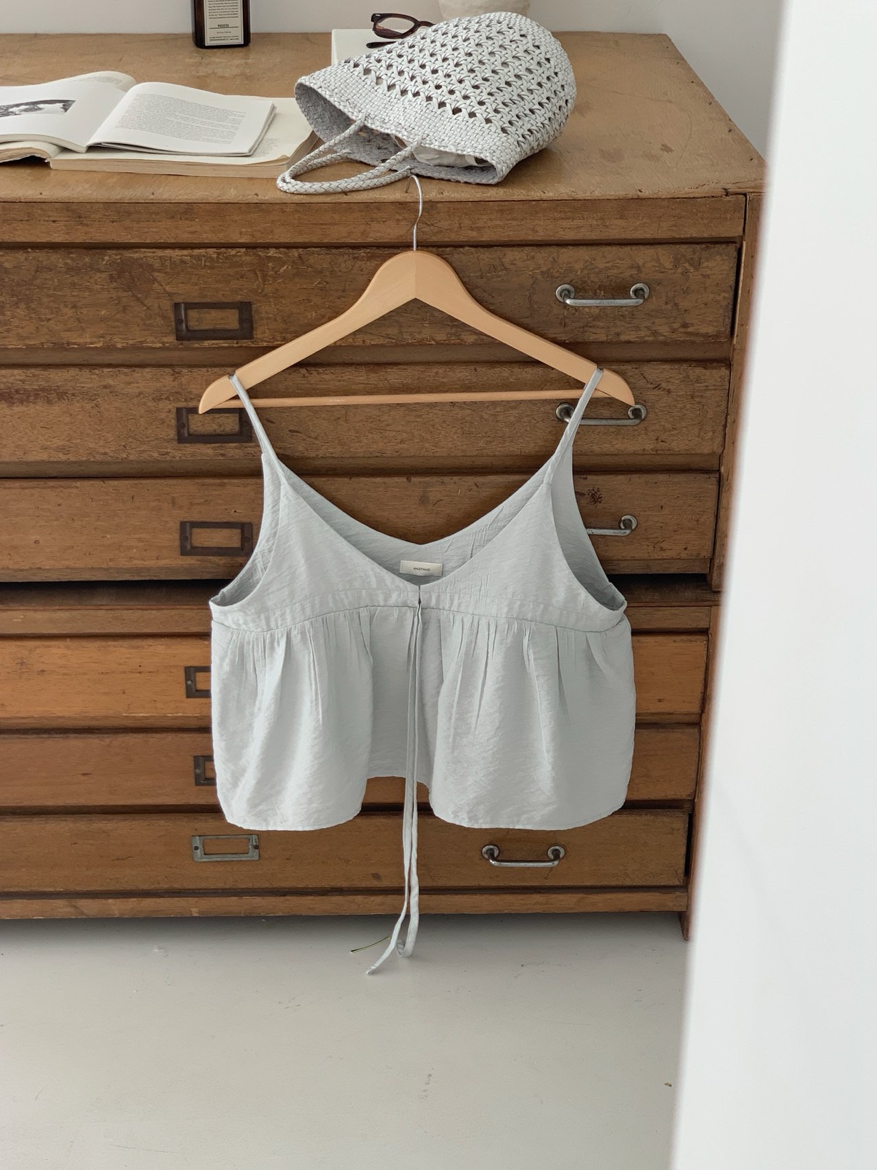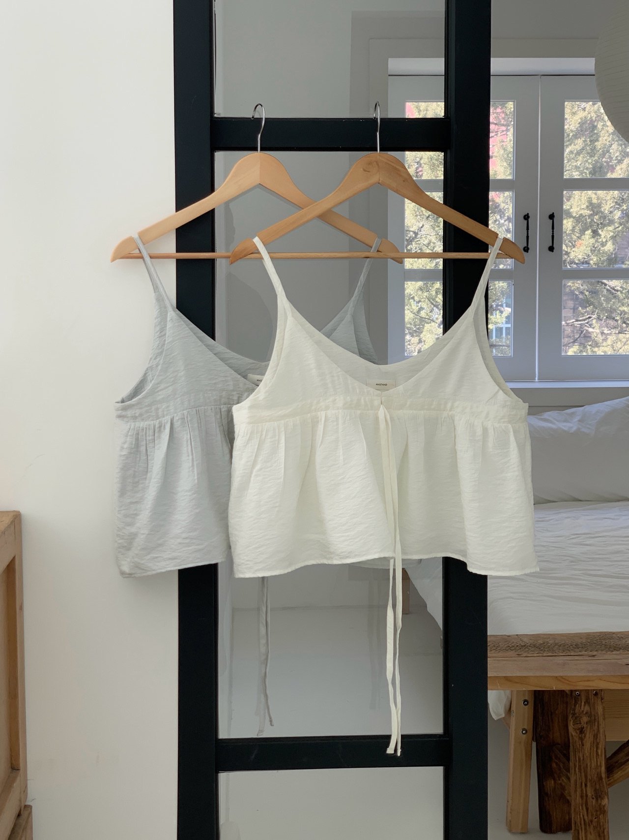 | Description | A soft bustier top with slender straps and a subtle V-neckline. The front tie detail adds a delicate point, while the flared hem creates a relaxed silhouette. Easy to layer over light blouses or tees, it completes a feminine yet effortless look for everyday wear. |