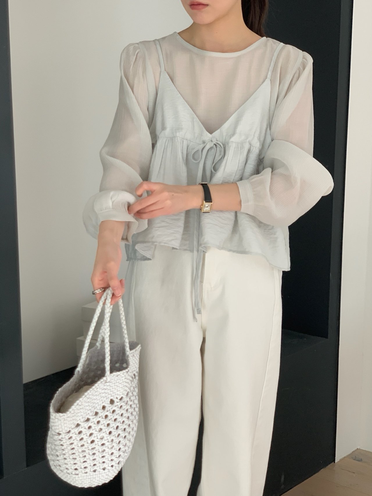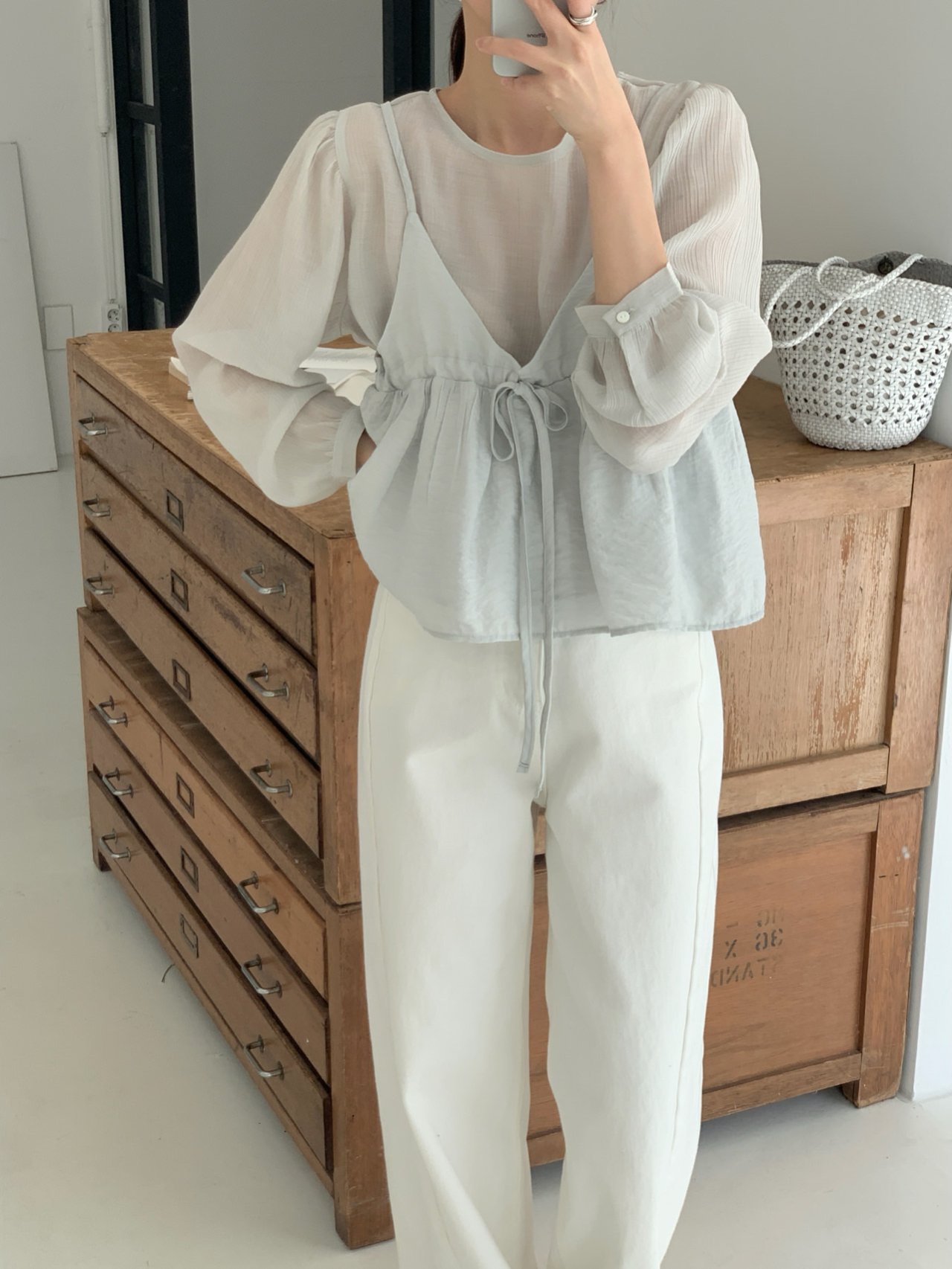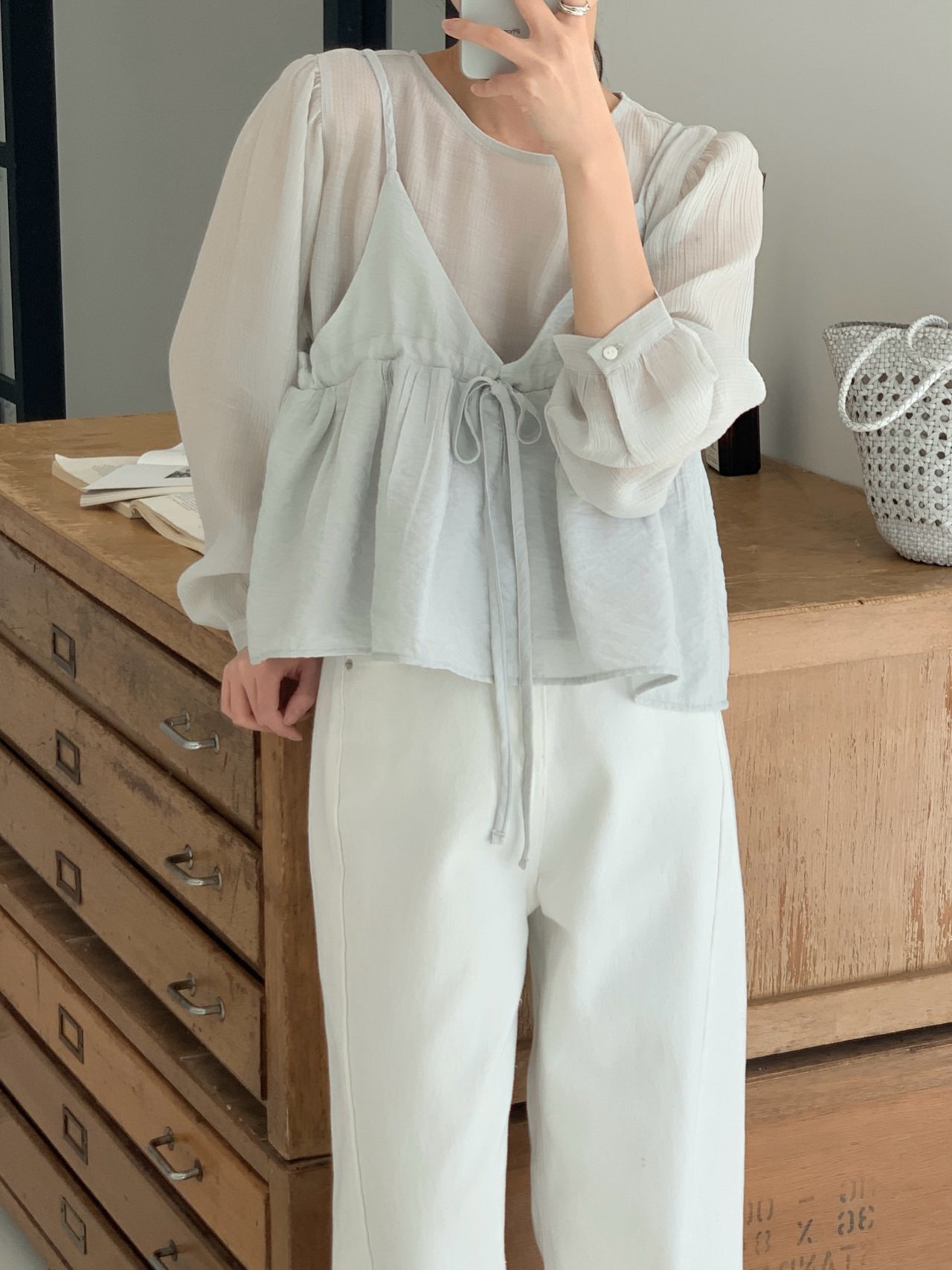 | Description | A soft bustier top with slender straps and a subtle V-neckline. The front tie detail adds a delicate point, while the flared hem creates a relaxed silhouette. Easy to layer over light blouses or tees, it completes a feminine yet effortless look for everyday wear. |