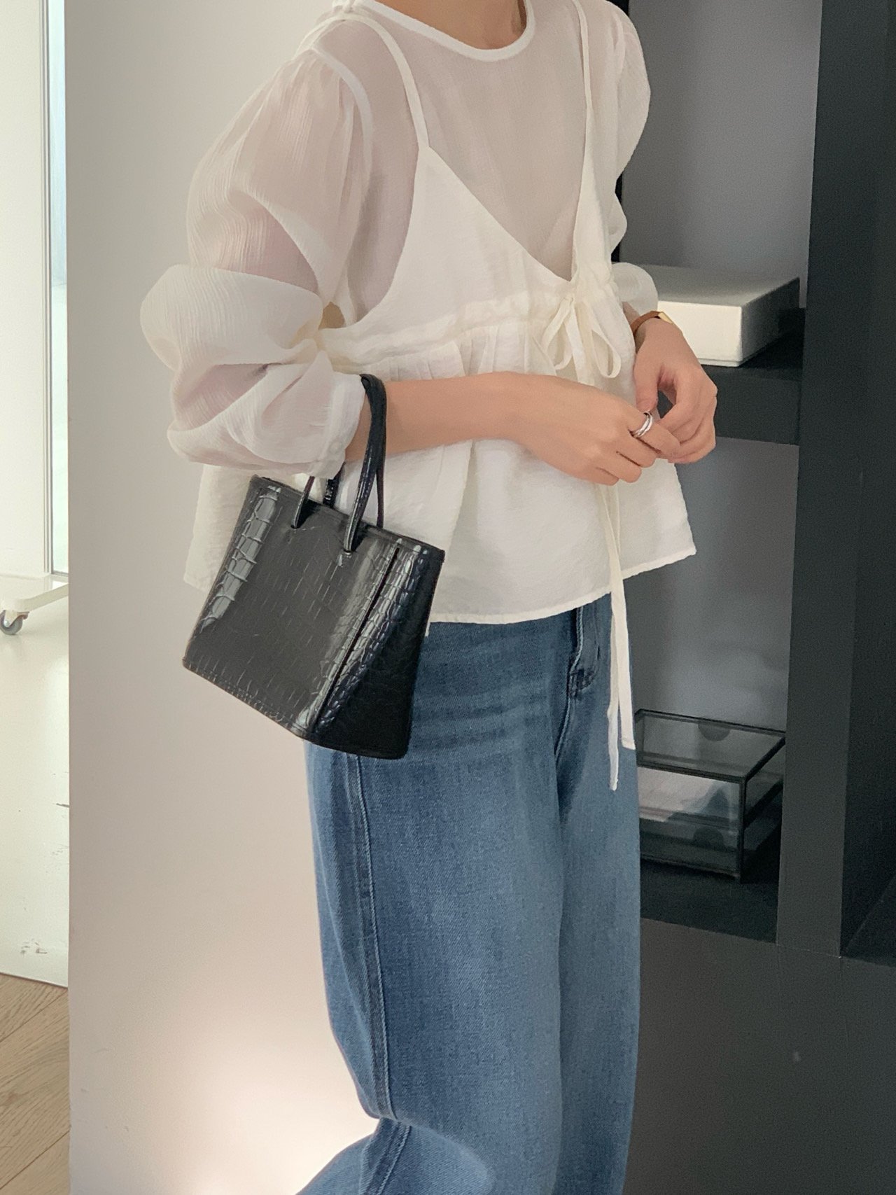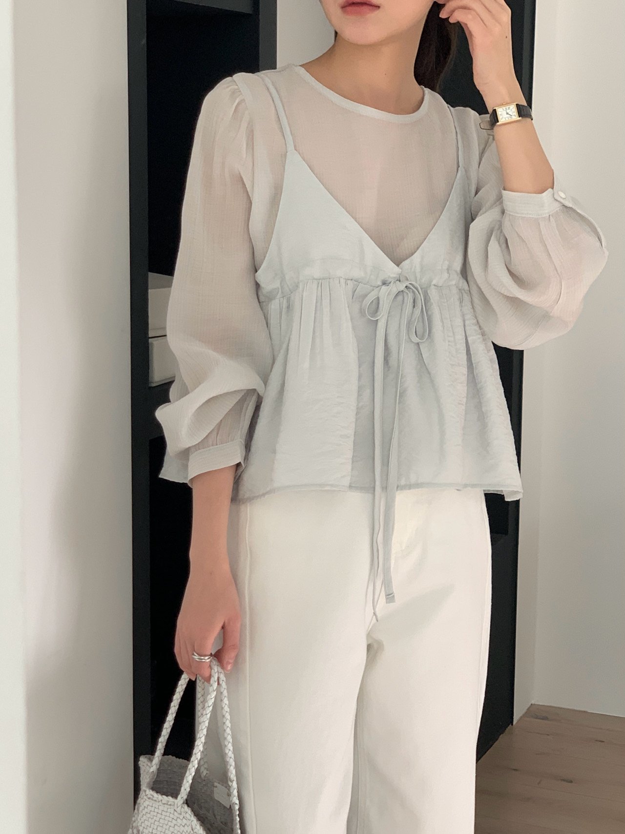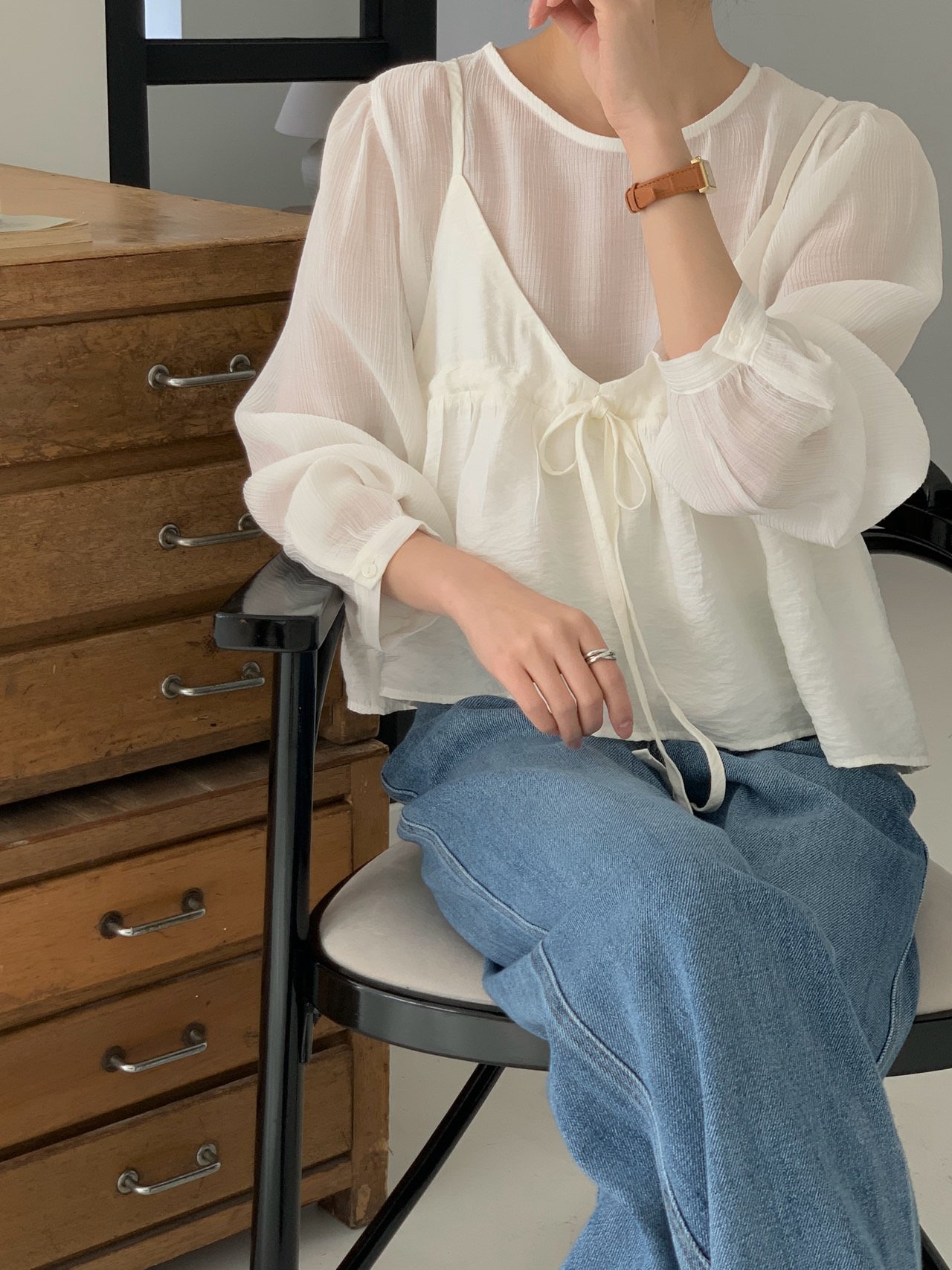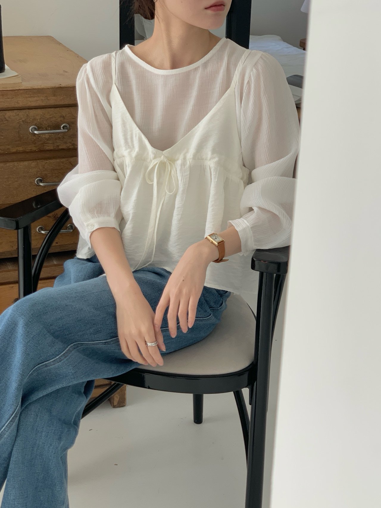 | Description | A soft bustier top with slender straps and a subtle V-neckline. The front tie detail adds a delicate point, while the flared hem creates a relaxed silhouette. Easy to layer over light blouses or tees, it completes a feminine yet effortless look for everyday wear. |